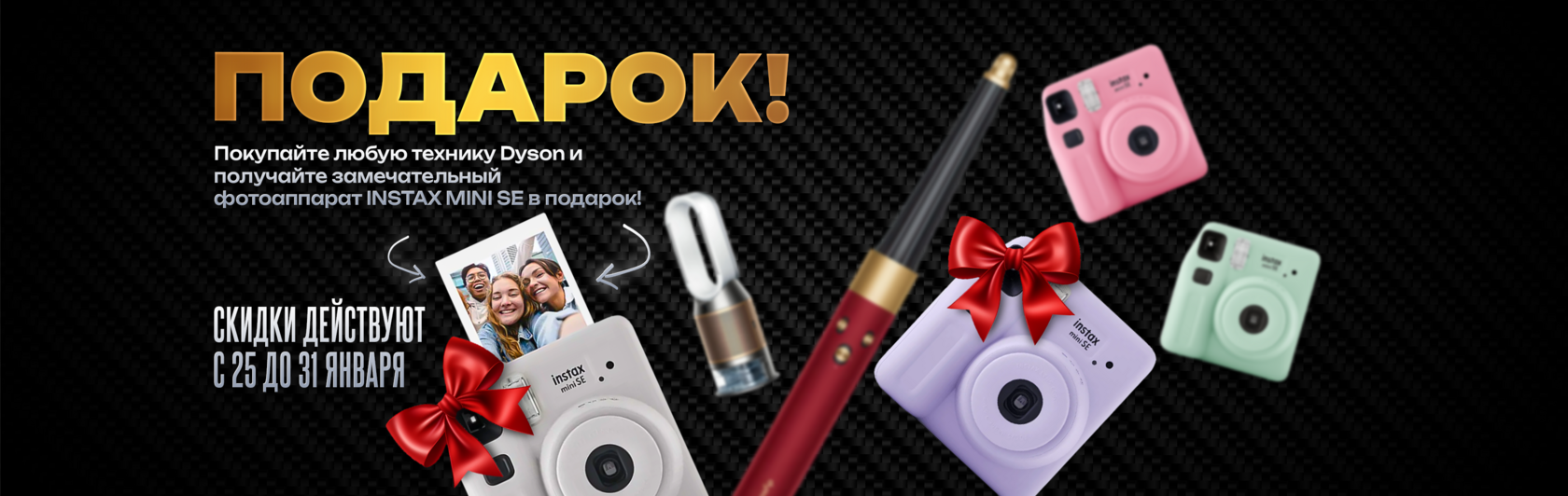 С 25 по 31 января купите любую технику Dyson и получите в подарок фотоаппарат Fujifilm Instax Mini SE!